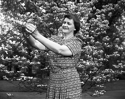 The Broughtons' term in the mansion, like that of the Bicketts a quarter century earlier, was dominated by a world war. Alice Broughton assisted in the war effort in many ways. She even carefully apportioned the food served at the mansion, including the traditional breakfasts served to General Assembly members. When word got out that meals at the governor's mansion were affected by wartime rationing, citizens from across the state sent the food stamps necessary to purchase many food items. Alice Broughton welcomed servicemen into the mansion for weekend visits, just as Mrs. Bickett had done during World War I. Alice Broughton promoted the national rubber drive by stripping fifty-eight pounds of rubber tread from the service staircase in the mansion and personally taking it to a collection center. She frequently christened Liberty ships that had been built at Wilmington. She also promoted victory gardens by tending one herself on the mansion grounds. The Broughtons boosted the morale of servicemen by inviting them to be overnight guests at the Executive Mansion.