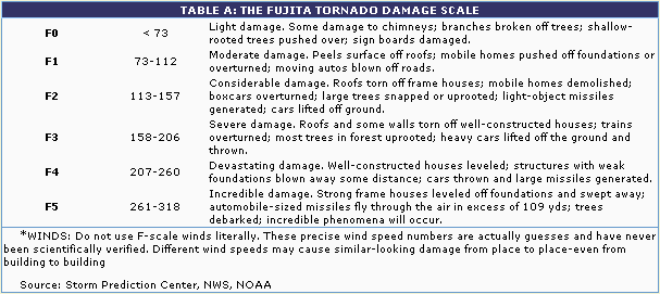 North Carolina's tornados are not able to compete with those of the central USA in frequency or intensity, Rarely exceeding F2 on the Fujita scale (shown in Table A). But sometimes they are features of weather which have major impacts. Most tornados are associated with isolated thunderstorms, and they tend to occur as small, relatively weak and isolated events. So their impact is usually minimal and local, with the amount of damage or injury caused depending greatly on exactly where the event occurs. So, in general, there are between 10 and 20 tornado days per year, most days having one or perhaps two tornados (Table 6). At irregular intervals there are more severe outbreaks, with several tornados spawned by a single weather system, and with more widespread impacts. Hurricane Floyd, for example, created 20 tornados along the coast on September 15, 1999.