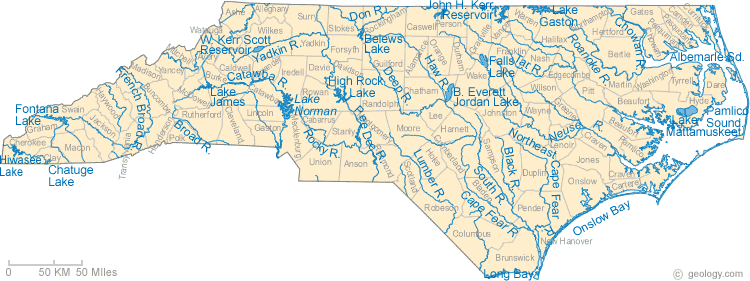 "North Carolina Lake Map, River Map, and Water Resource." Map courtesy of Geology.Com.