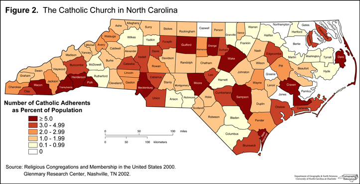 Figure 2 displays the relative distribution of Catholics within the state. The growth of the Catholic church in North Carolina is a relatively recent phenomenon. It appears to be associated primarily with the in-migration of people from the northeastern US, where the Catholic Church is historically strong, and of Latinos, many of whom also are of the Catholic faith. The association of Catholics with recent in-migrants explains the fact that the larger proportions of them are found in several different types of locations. One is in metro areas such as Mecklenburg, New Hanover, Onslow, Orange, and Wake counties. Others are in Dare, Moore, Pasquotank, and Polk counties, all popular destinations for retirees from other parts of the US. Yet another location is in some rural/agricultural areas that have attracted Latino farm workers. Sampson County illustrates this pattern. On the other hand, several counties, primarily in the northeastern corner of the state, reported no Catholic congregations. These areas are also among those that are experiencing either population losses or slow growth, as shown in the the NCpedia section on Population.