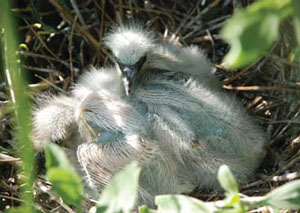 Young snowy egrets are completely dependent upon their parents for food and protection from the elements and predators. Both parents share in these duties, and the energetic young are climbing around in the nest tree by their third week. Weather is a big factor in the survival of young snowy egrets. Periods of cold, rainy weather during the breeding season result in high chick mortality in the rookeries and often cause a second nesting attempt by unsuccessful breeding adult egrets.