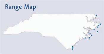 The snowy egret has a definite affinity for salt or brackish water and is found close to the beaches and marshes of the North American coastline. Unlike most other long-legged waders, this egret remains in its marine environment throughout the year. Other wading species tend to wander widely during the summer, and are often found hundreds of miles inland from their breeding or wintering areas. In North Carolina, the snowy egret breeds from Currituck Sound to the mouth of the Cape Fear River. It also winters in North Carolina, but in reduced numbers.